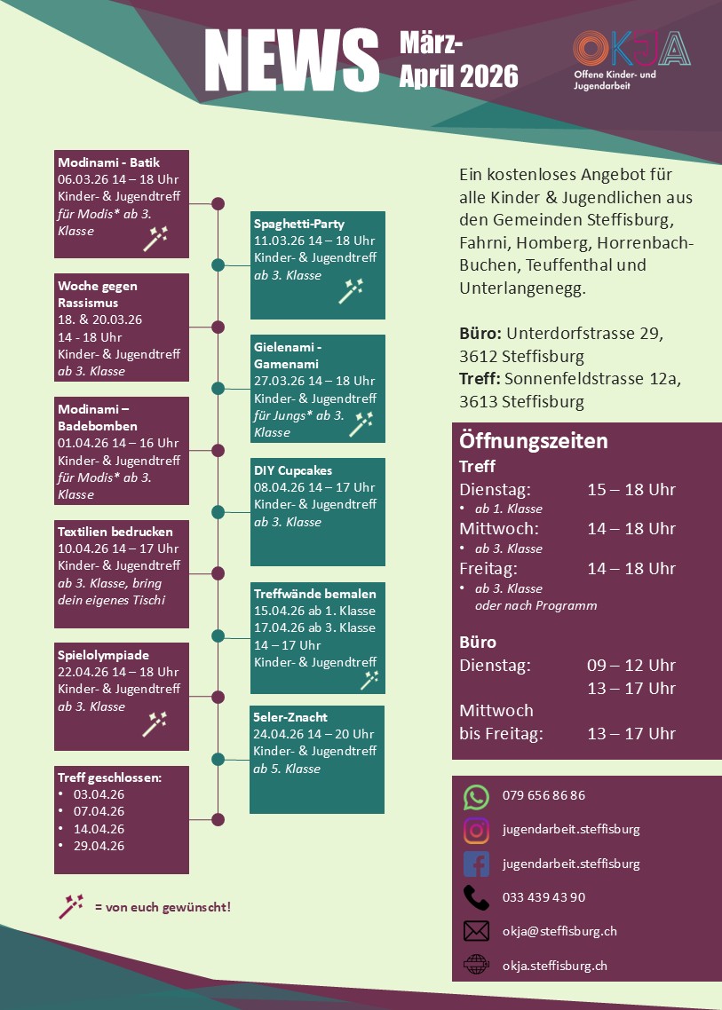 Das neue Programm für den Frühling 2026 ist da. Ob Batik, Spaghetti essen oder Treffwände bemalen, spannende Angebote warten auf dich. Komm vorbei, wir freuen uns auf deinen Besuch.